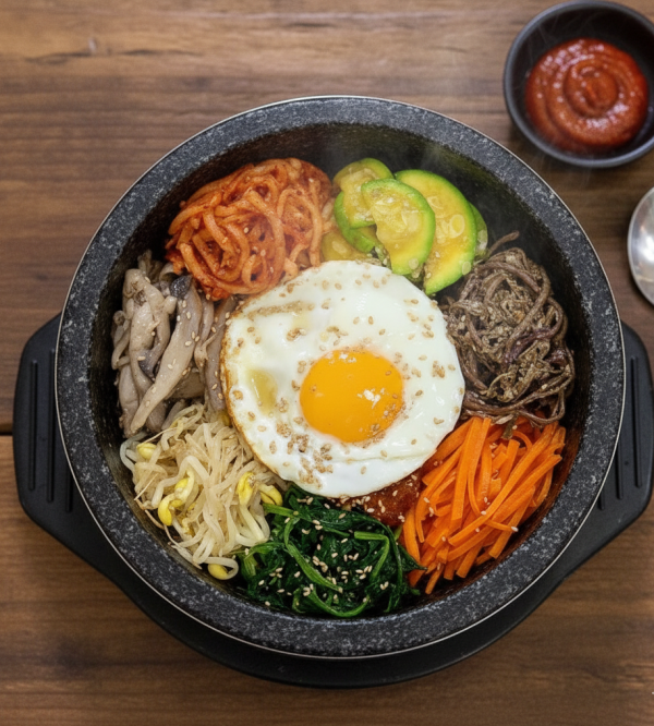 - The Protein and Finisher: Usually topped with seasoned minced beef (Yukhoe or Bulgogi style) and a raw egg yolk. The heat of the stone pot is responsible for cooking the egg and searing the beef as the diner mixes the ingredients.