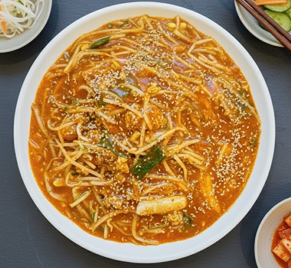 The soul of the dish, however, is the Yangnyeom—a vibrant, crimson reduction of sun-dried gochugaru (red chili flakes), fermented aromatics, and a clandestine blend of seafood stocks. This sauce is not merely a coating; it is a glaze that must achieve a specific viscosity, often aided by a precise starch slurry that lends a silken sheen to the finished plate. The addition of thick, head-less bean sprouts (kongnamul) is a technical requirement; they are tossed at the final, fleeting moment to ensure they retain a structural \"snap,\" providing a rhythmic counterpoint to the yielding tenderness of the fish.