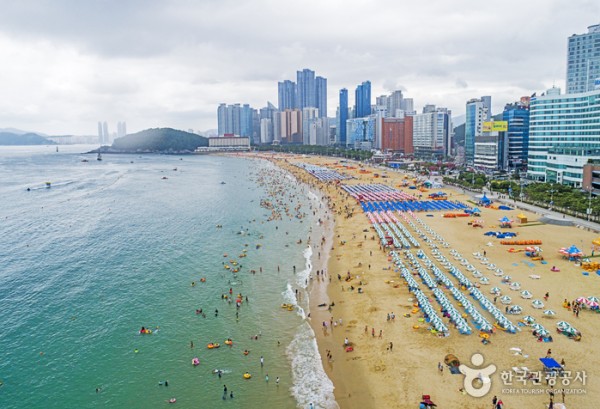 Haeundae Beach is the most famous beach in Busan. The white sand beach is roughly 1.5 kilometers long, over a 30- to 50-meter wide area, creating a beautiful coastline before a shallow bay, making it perfect for swimming.