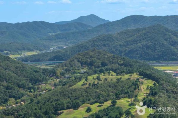Some of the most prominent landmarks are the 200 gobuns (ancient tombs) that lie along the southeastern slope of Jusan Mountain in Goryeong. In ancient times, the higher and larger a tomb, the higher the social status of the person buried inside. Given this tradition and historical evidence, the largest tomb in the south has been identified as Geumnim Wangneung (Royal Tomb of King Geumnim); the other large tombs are also presumed to be those of the kings of Daegaya. The large royal tombs (over 20m in diameter) dominate the mountain ridge (the highest point) while mid-sized and smaller tombs can be found on the mountain slopes and foothills.