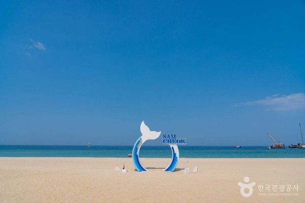Samcheok Beach is easily accessible and has a vast white sandy beach that is 1.2 kilometers long and 100 meters wide. Thanks to its pine tree forest, clean white sand, shallow waters, and convenient amenities, over 500,000 vacationers visit the beach every year. Entertaining events such as a barehanded flounder fishing contest also take place here.