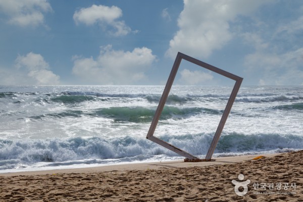 Sokcho Beach opened in 1976 and is one of Korea's representative beaches. It is close to Sokcho's downtown, and the express bus terminal is also within walking distance, so transportation is convenient. With clear sea water, shallow depth, and a gentle slope, Sokcho Beach attracts visitors from all over the country every summer. Especially during the high season in July and August, the beach is so cluttered that there's nowhere to walk. There are many restaurants and facilities near the beach. And there is a pine forest with a small park and a trail behind the beach. The sculptures installed throughout the sandy beach are a sight to see regardless of the season, so tourists continue to visit even after the holiday season. There are sculptures including the Korean initials "ㅅㅊ" symbolizing Sokcho, a large compass showing directions to countries around the world, and a dolphin sculpture. The large picture frame with the blue sea in the background and the Stairway to Heaven are the most popular photo spots here. The beach often serves as a venue for a variety of events like performances and festivals.