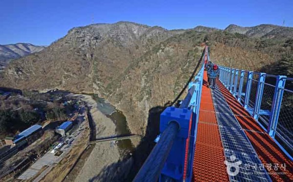 One of the main attractions of Wonju, Sogeumsan Suspension Bridge is the longest and largest pedestrian bridge in Korea with a length of 200 meters, a x_height of 100 meters, and a x_width of 1.5 meters. The thrill of walking midair is enough to make visitors come to this attraction. The skywalk next to the bridge offers an amazing view of the surroundings. With a protective deck at the entrance of the bridge, anyone who has the courage can walk on the bridge. Other attractions nearby include Wonju Railbike, Museum SAN, the Grave of Joeom, and more.
