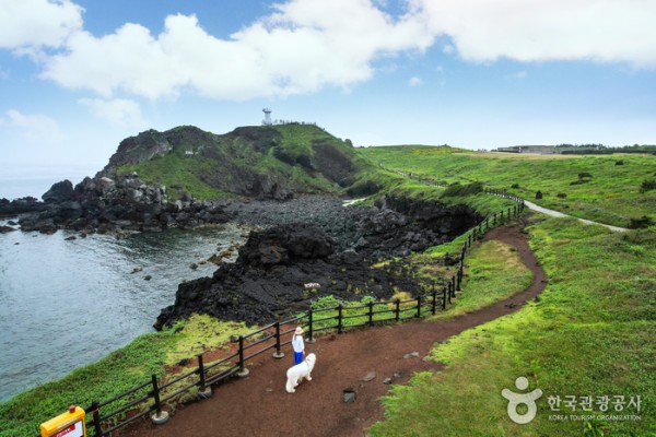 Seopjikoji gets its name from its shape, jutting out to sea, with 'koji' being the Jeju dialect for a cape. Located just south of Seongsan Ilchulbong Tuff Cone, the cape is a popular tourist attraction. The tuff cone along with a beautiful vista of the ocean and fields of canola flowers can easily be seen from the peak of Seopjikoji. On top of the hill stands a beacon fire station, reaching 4 meters in x_height with a diameter of 9 meters, built using volcanic rocks. Behind the beacon fire station is Bulgeunoreum Volcanic Cone, vibrant with red soil. The white lighthouse atop the cone stands out in contrast. Seopjikoji has been used as a filming site for many Korean movies and dramas.