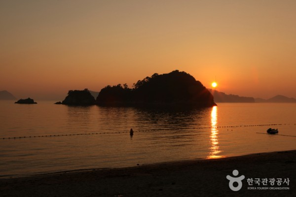 Bijindo Island is located 13 kilometers from Tongyeonghang Port. The island's main attraction is the 550-meter-long beach. Due to the unique formation of the island, with the beach appearing to connect two separate islands, it is possible to view both the sunrise and the sunset from the beach. The western side is a sandy beach, while the eastern side is a pebble beach.