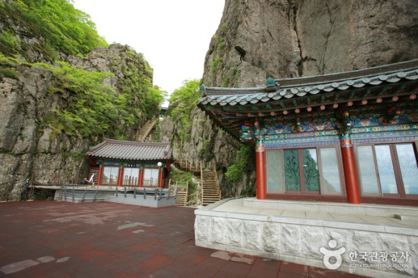 Yaksaam Hermitage was founded during the Silla dynasty atop Geumosan Mountain in Gumi City. Yaksajeon Hall, the centerpiece of Yaksaam Hermitage, stands at the base of a rocky cliff. The granite Seated Rock-Carved Medicine Buddha, enshrined in Yaksajeon Hall, along with those at Sudoam Hermitage on Sudosan Mountain and at Samseongam Hermitage on Hwangaksan Mountain, are collectively known as the Three Brothers. Spring water flows out of a crack in the rock wall on the east side of the temple. Legend has it that in the past, grains of rice once fell one by one from this hole.