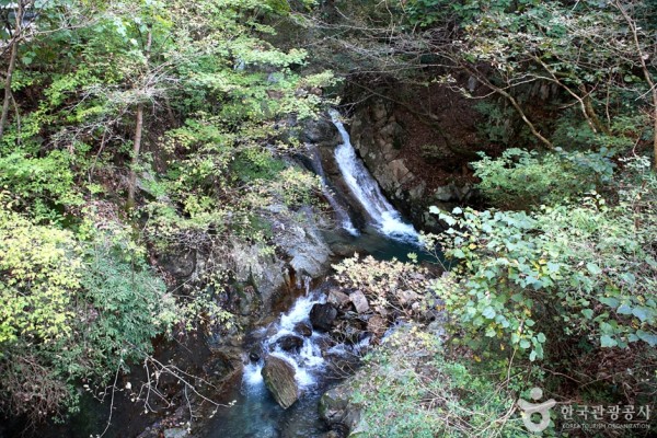 Three kilometers up Domachigyegok Valley from Sampalgyo Bridge, Yongsopokpo Falls flows peacefully into Yongso Pond. The water originates from Domacheon Stream, which passes through rugged mountains like Seongnyongsan, Domachiryeong Pass, Silloryeong Pass, and Gungmangbong Peak 1,000 meters above sea level. The waterfall is in striking harmony with the surrounding landscape. Yongsopokpo Falls pools into a clear, blue pond, which is surrounded by rocks. In the fall, the pond receives some added beauty in the form of the surrounding autumn foliage, so it is a popular photo spot for hikers.