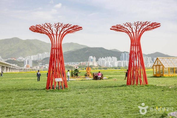 Daejeo Eco Park is an ecological park stretching from Gupodaegyo Bridge to the Nakdonggang Estuary Bird Sanctuary. It encompasses various wetlands and waterways, including Sindeokseupji Wetland, along with grasslands, mustard flower fields, and various sports facilities, providing a place for leisure and relaxation. Particularly noteworthy is the Mustard Flower Festival held annually in April at the mustard flower field developed below the Gupodaegyo Bridge.