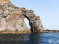 Gyeongsangbukdo Dokdo-ri, Ulleung-eup, Ulleung-gun, Gyeongsangbuk-d Dongnimmunbawi Rock, situated on the East Island of Dokdo, is a striking formation resulting from the accumulation of volcanic ash. It projects prominently into the sea, its lower part sculpted by waves into an arch-like cave. This natural structure earned its name due to its resemblance to Dongnimmun Arch (Independence Gate) in Seoul, mirroring the iconic landmark's distinct architectural features.